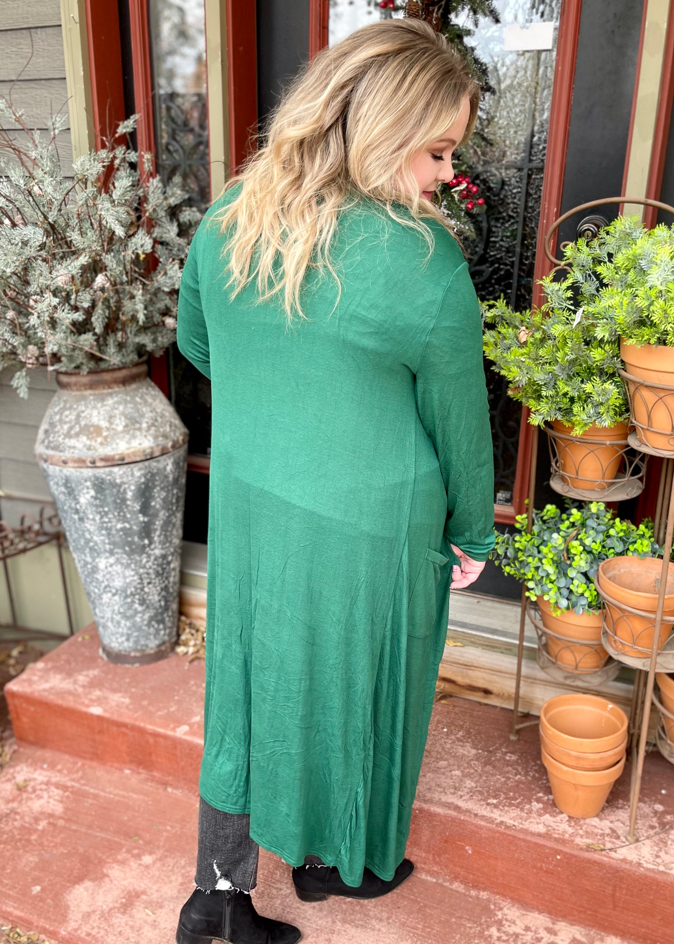 Ooh la la, this cardigan is a must have! Featuring soft lightweight material, long sleeves, front pockets, and a draped open front silhouette that cascades into a straight calf-length hemline!