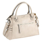 The concealed carry Jessica purse is made from soft faux leather, offering ample storage with gathered pockets on each end, a front zippered pocket, and a spacious divided interior.