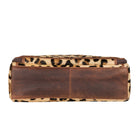 The genuine leather hair-on Josie features a unique Indian Leopard print trimmed in leather. This bag offers ample storage options. The front and back feature a large full-size open slip pocket with magnetic closure.