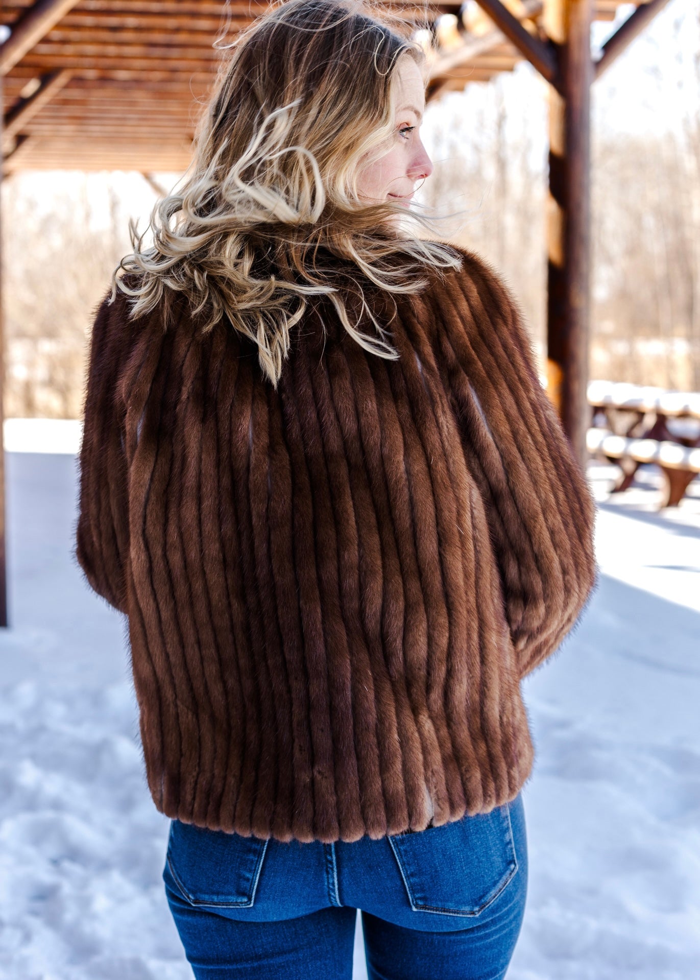 This corded brown mink jacket exudes vintage Western charm with a touch of luxe sophistication. The unique corded mink design creates a rich texture, enhancing the warm brown hue with depth and dimension. Accented with lavish fox fur trim along the collar, this piece strikes the perfect balance between rugged and refined. Thoughtfully designed with front pockets for practicality and a smooth silk lining for ultimate comfort, this jacket is a true statement of effortless elegance with a frontier spirit. Whether paired with denim and boots or draped over an evening ensemble, it embodies timeless Western luxury.