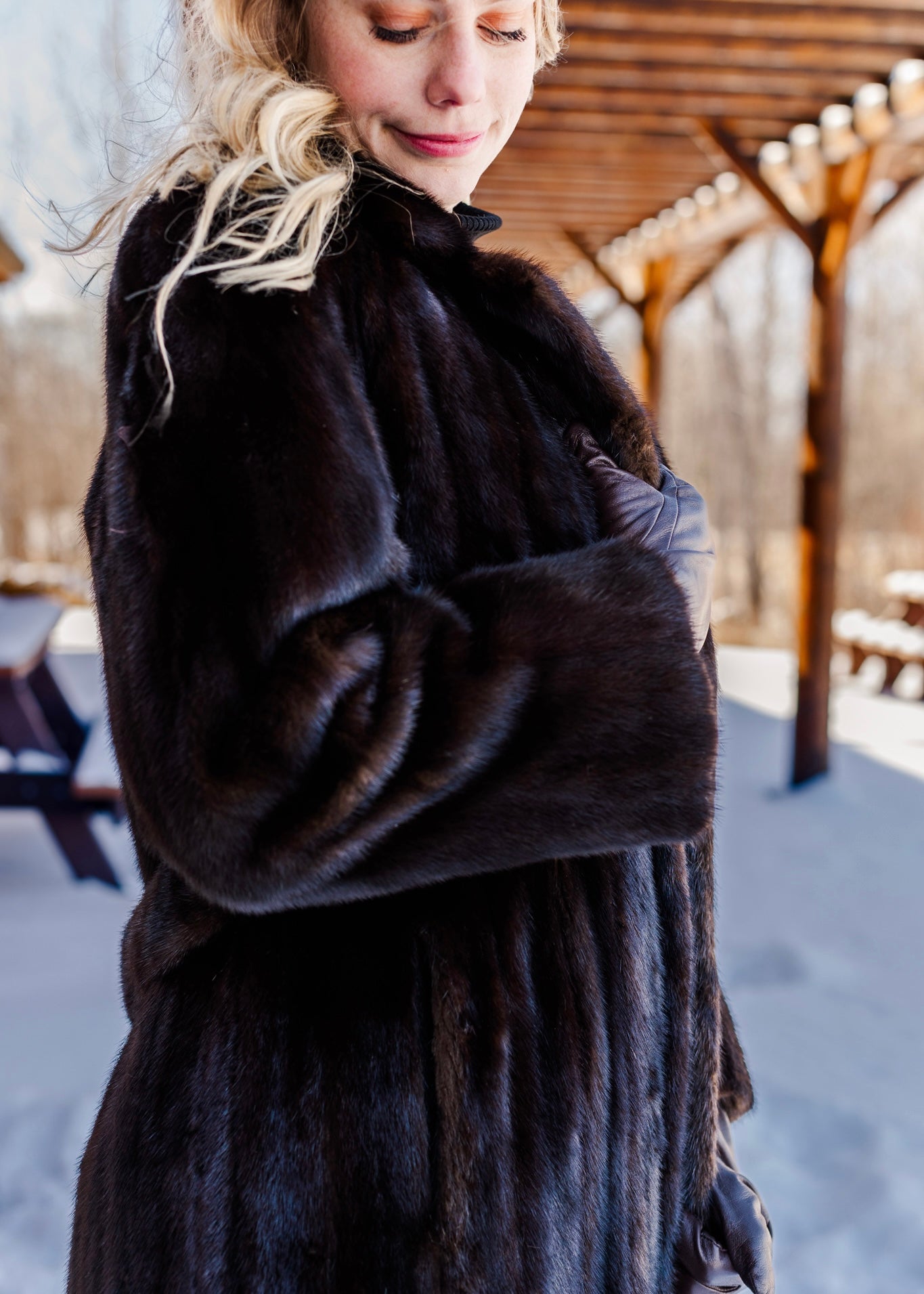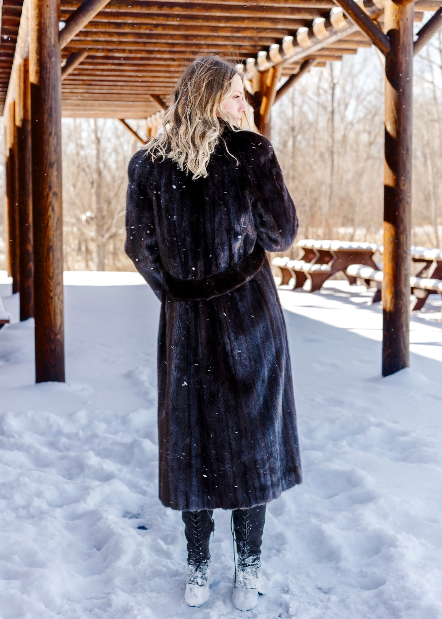 This exquisite full-length mink coat is the epitome of timeless luxury and sophistication. Crafted from the finest, high-quality mink pelts, it boasts an ultra-soft, velvety texture with a flawless, luminous finish. The elegant silhouette is enhanced by a subtle back belt detail, adding a touch of structure and refinement to its graceful drape. Designed for both warmth and style, the coat is fully lined with smooth, sumptuous silk, ensuring a luxurious feel against the skin. Whether worn over an evening gown or paired with tailored ensembles, this statement piece is a testament to impeccable craftsmanship and enduring elegance.
