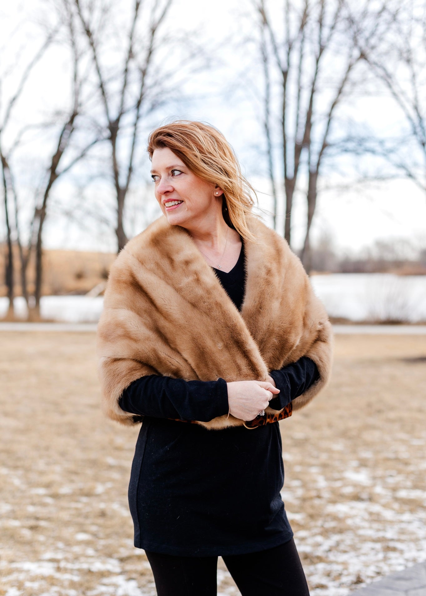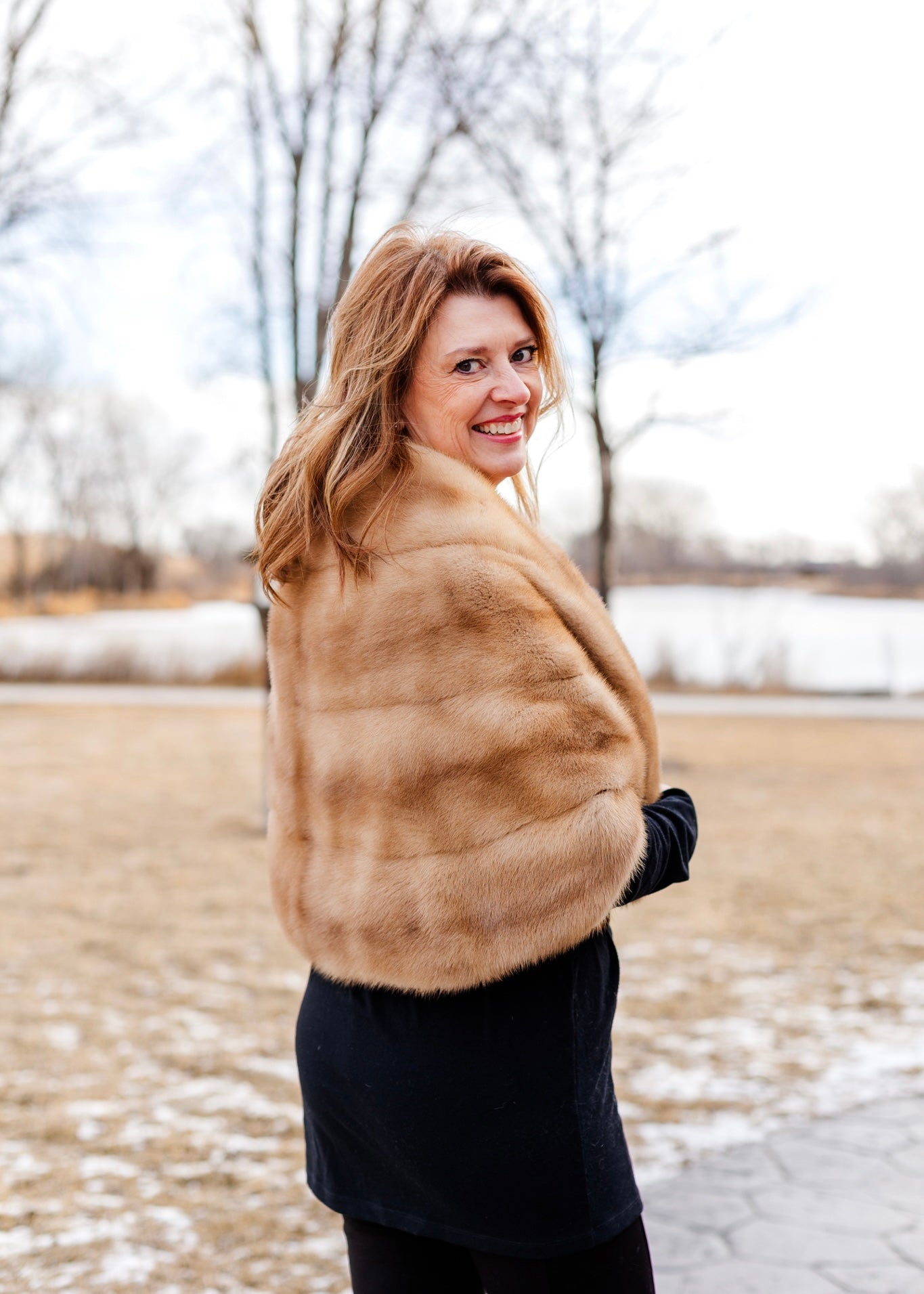 Whether draped over your shoulders for a wedding, gala, or evening event, this palomino mink stole combines classic beauty with modern convenience, making it a cherished addition to any wardrobe.