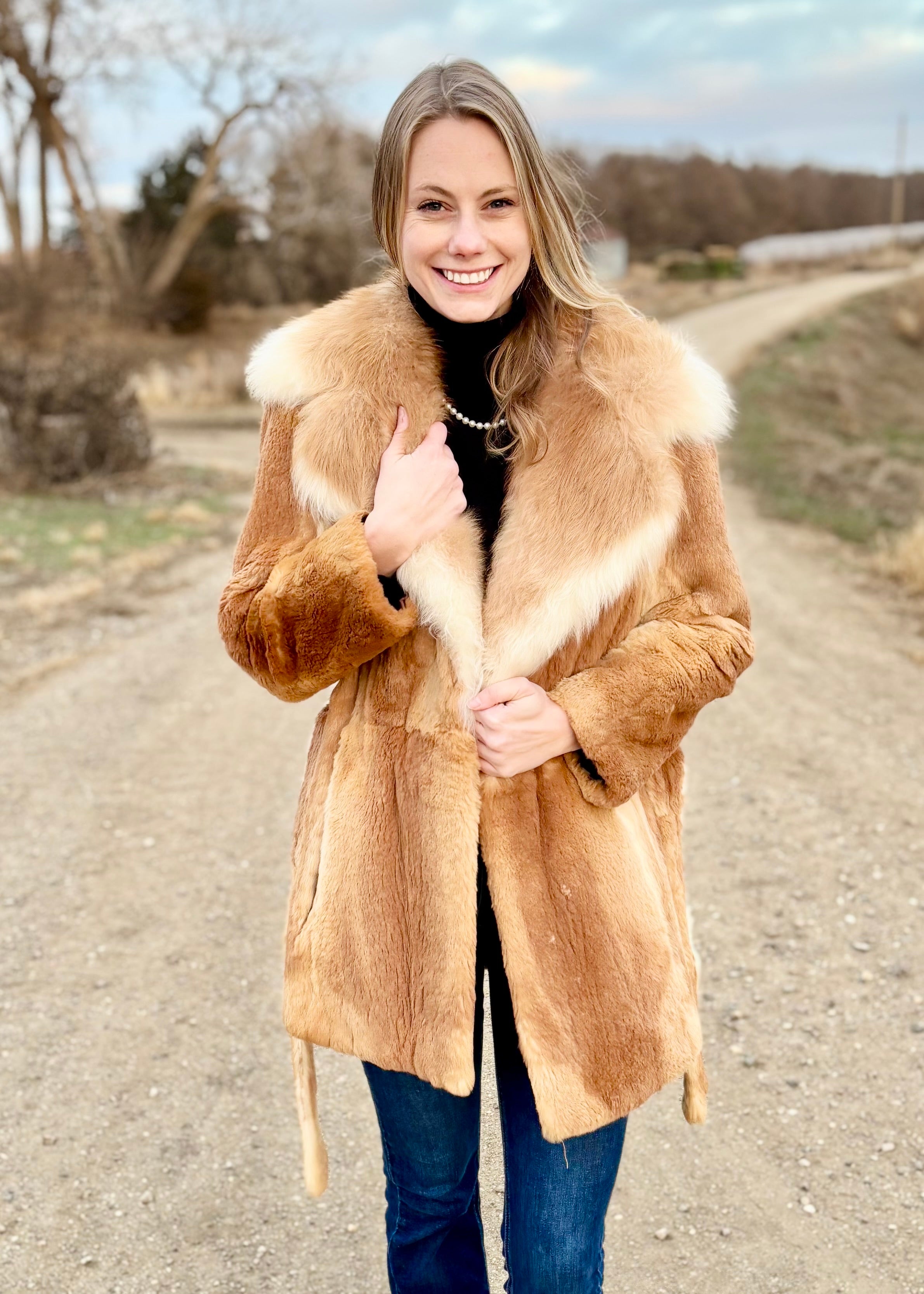 A dramatic shawl collar sweeps around the neckline, framing the face in luxuriously full fox fur. It adds instant glamour, enhancing the jacket’s silhouette and providing decadent comfort against the skin. The subtle hook-and-eye closure keeps the front clean and polished, allowing the fur’s color and workmanship to take center stage.