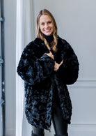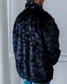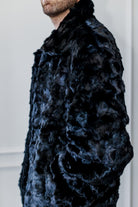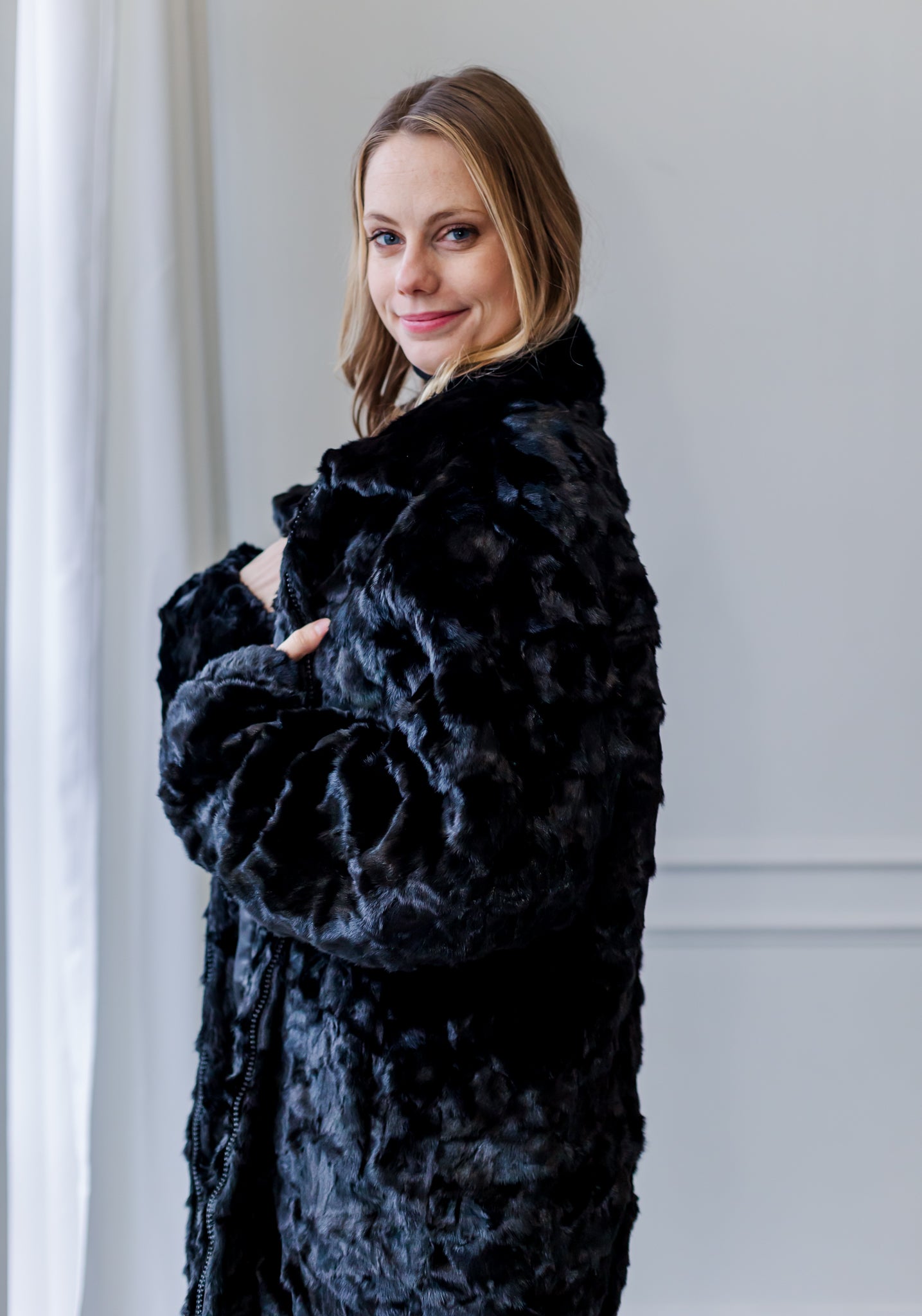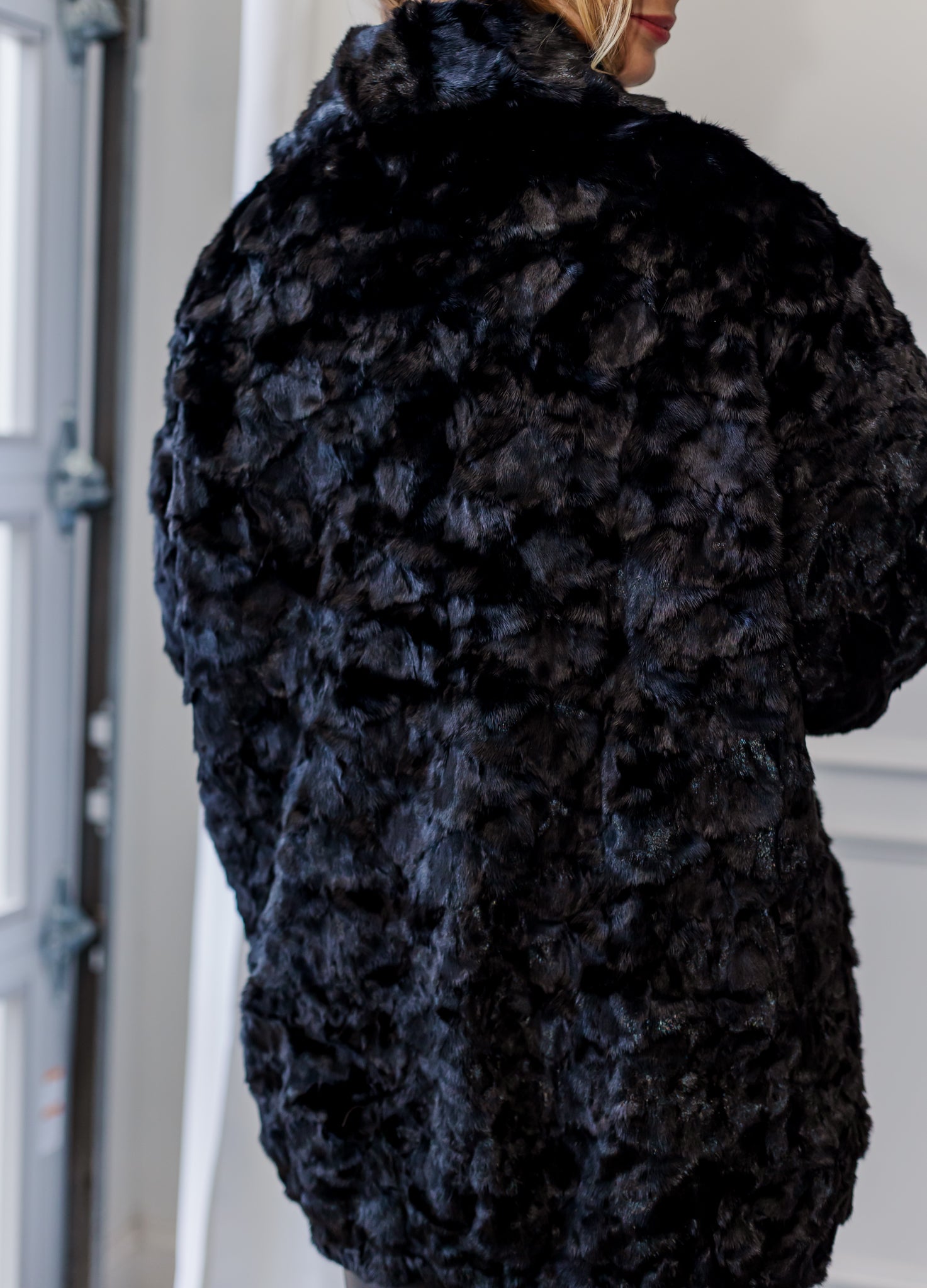 This stunning black mink jacket stands out with its beautifully textured pelting, creating a distinctive pattern that gives the classic mink silhouette a modern, luxurious twist. The rich, deep black fur has a velvety softness and a subtle sheen that catches the light, adding depth and dimension to its sculpted look.