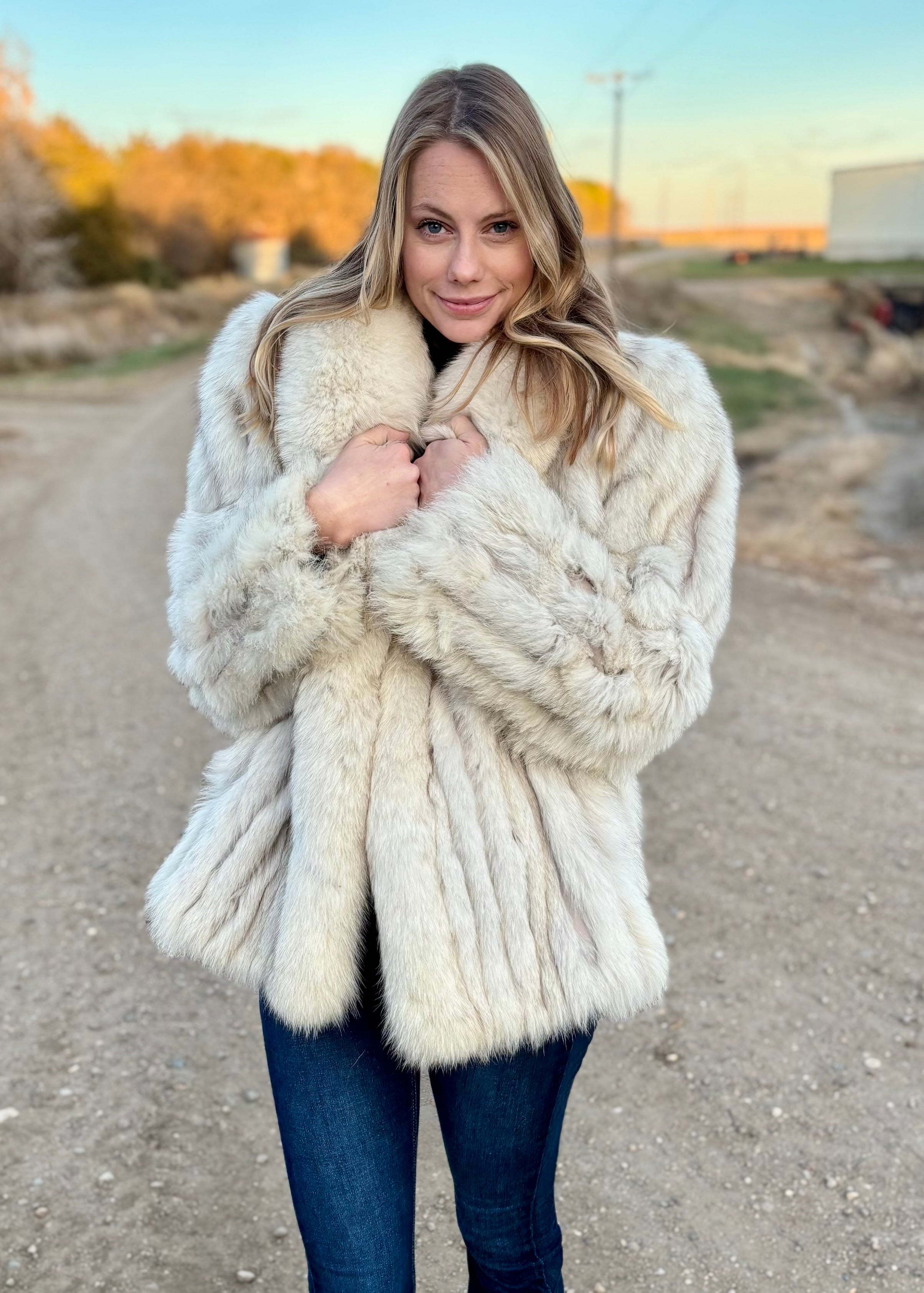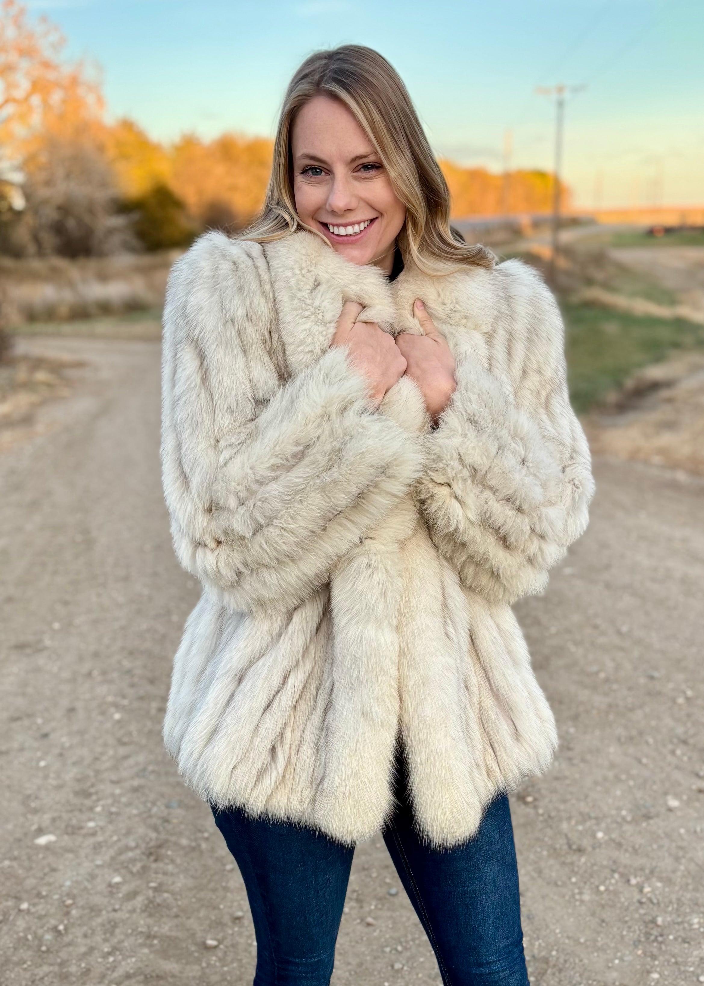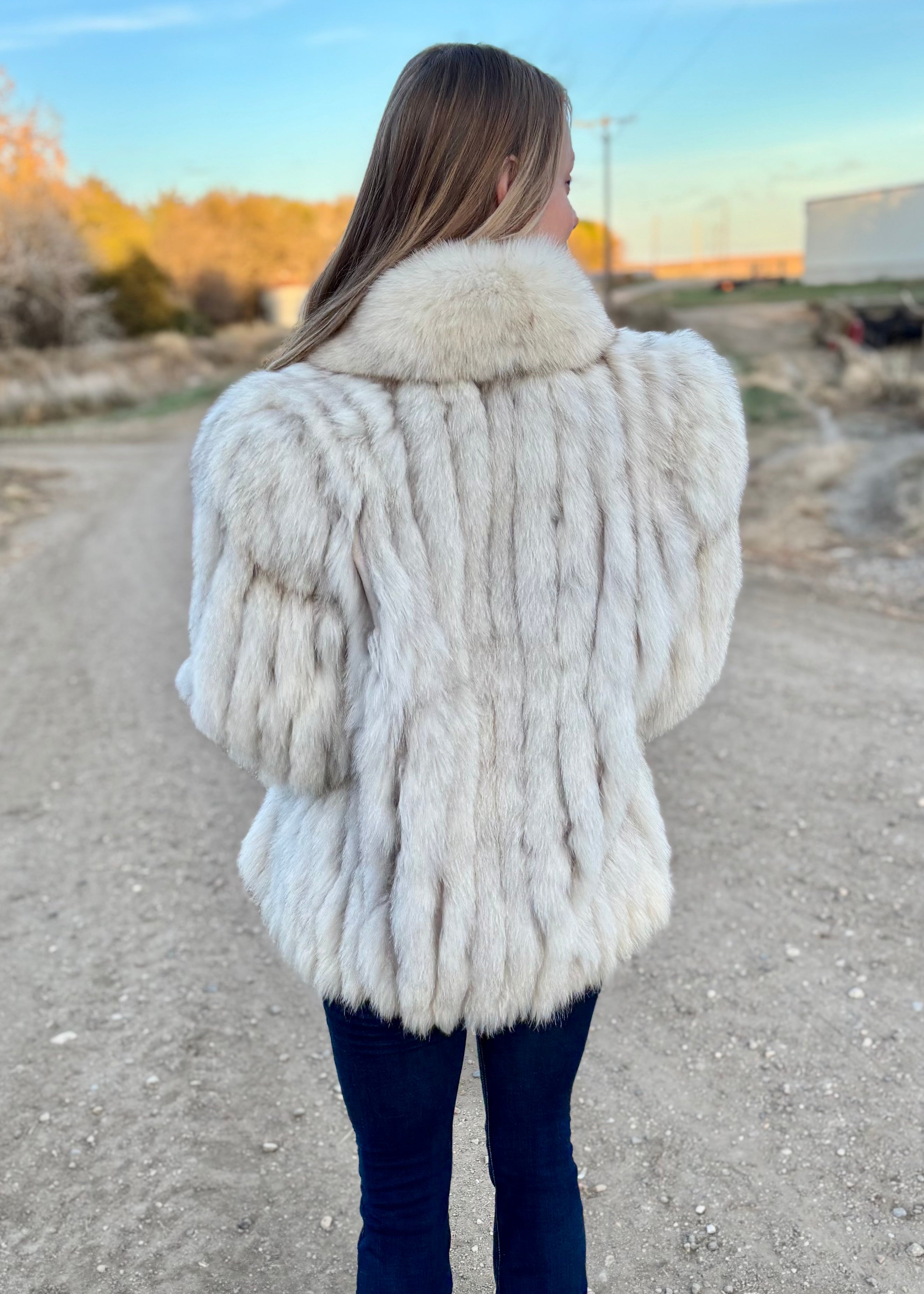 Perfect for crisp autumn evenings or winter soirées, this blue fox jacket is a statement of refined opulence—vintage-inspired glamour meets modern wearability. One-of-a-kind and ready to elevate any wardrobe.