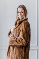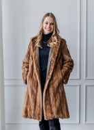 This palomino mink coat features beautifully soft, evenly toned pelts with a warm golden hue. Its sleek, classic silhouette and simple stand-up collar create an elegant, timeless look. Lightweight yet wonderfully warm, it’s a luxurious coat that adds refined style to any winter outfit.