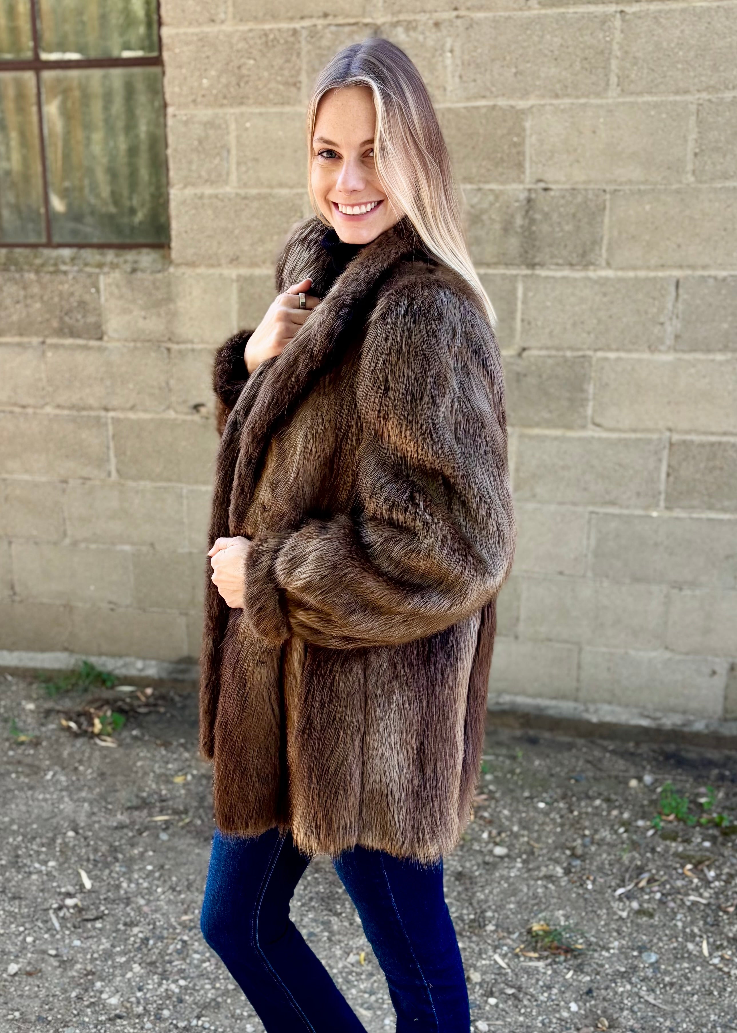 This luxurious vintage beaver fur jacket is the perfect balance of elegance and warmth. Crafted from genuine beaver pelts, it features a rich blend of warm brown tones with natural luster and depth. The plush, soft texture provides exceptional insulation, while the structured silhouette gives it timeless sophistication. Designed with a straight cut, side pockets, and a classic collar, this coat effortlessly combines functionality with style. Ideal for cold-weather wear, it’s a statement piece that pairs beautifully with both casual and formal looks.
