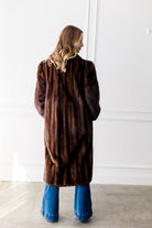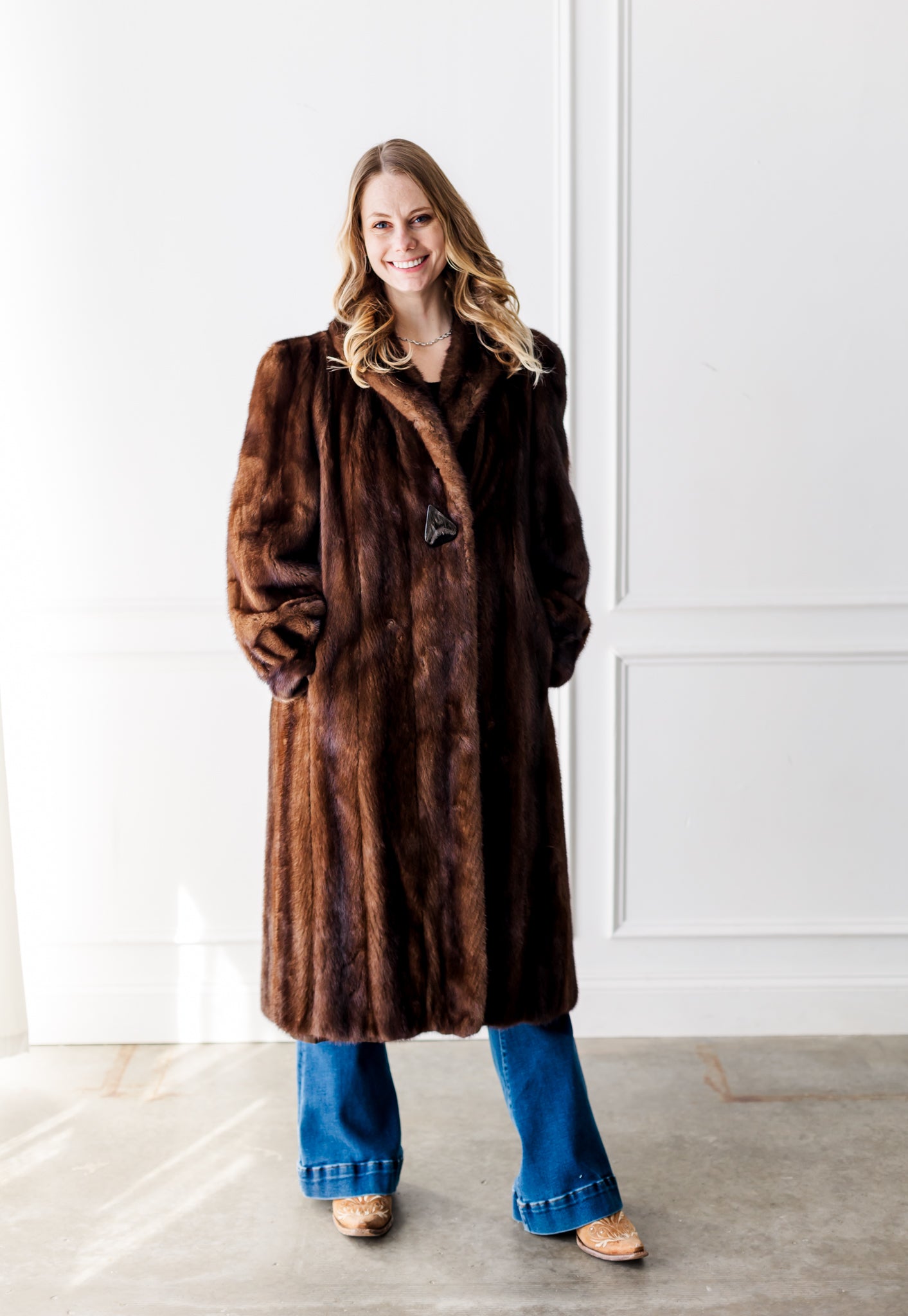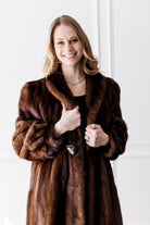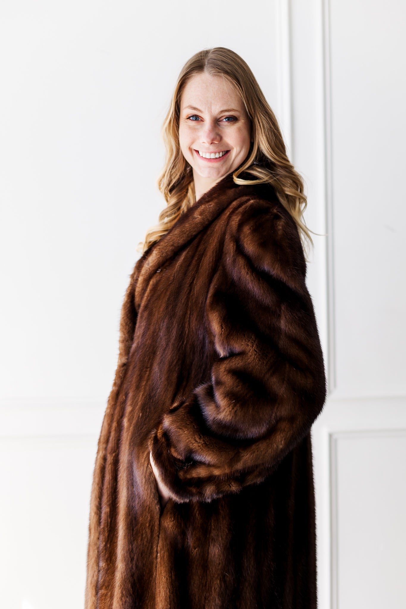 This elegant full-length ranch mink coat showcases rich natural brown tones with beautiful depth and sheen. Crafted in a timeless silhouette, the coat drapes effortlessly while the soft shawl collar adds classic sophistication and warmth. The plush, velvety mink fur gives it an incredibly luxurious feel while remaining lightweight and comfortable. A refined, heirloom-quality piece that embodies timeless fur elegance.