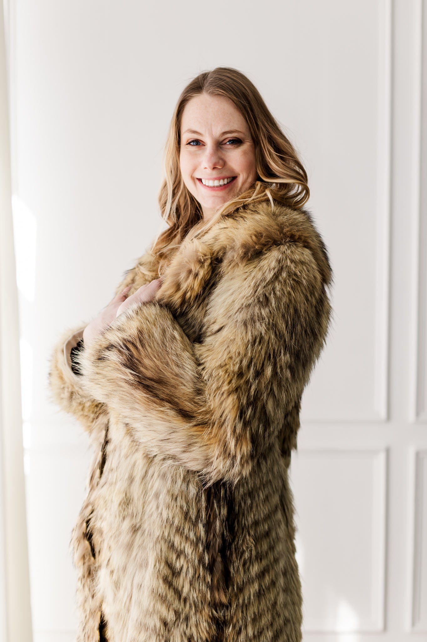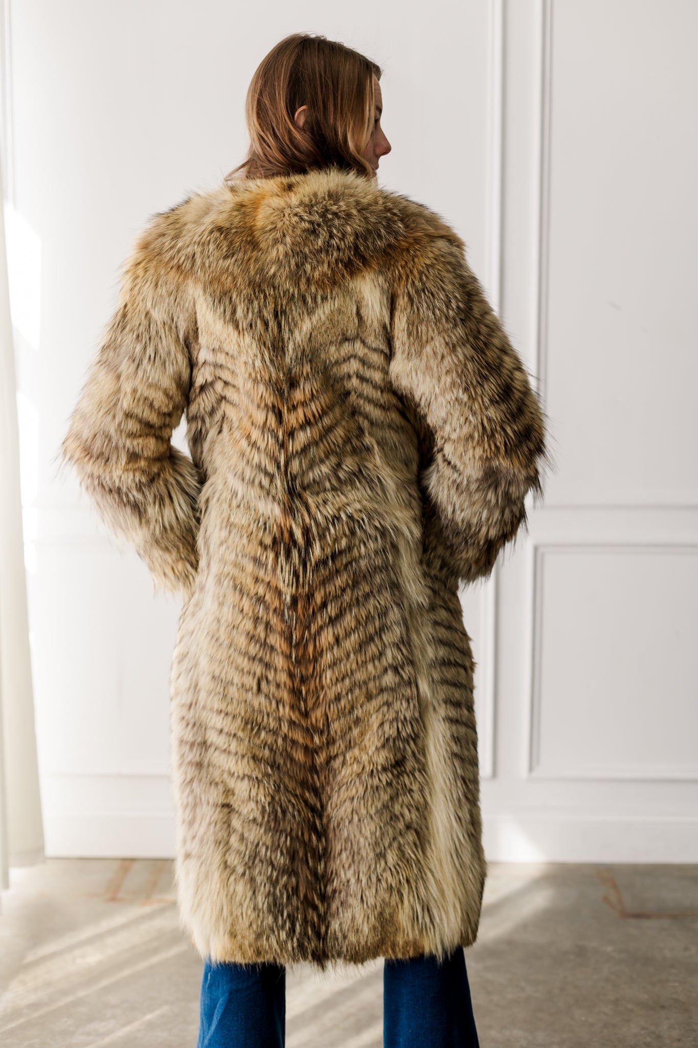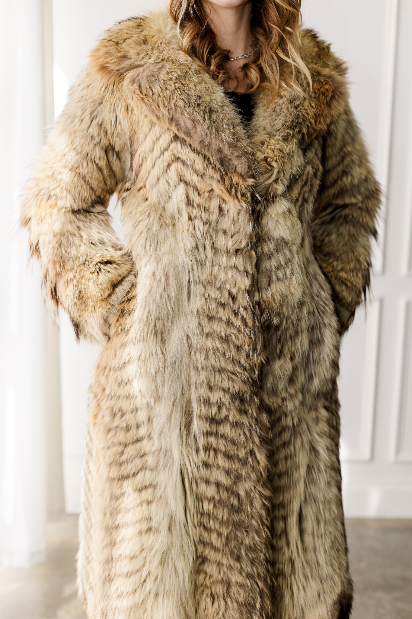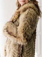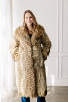 This full-length coyote coat showcases the stunning natural variation of premium coyote fur, with rich tones of golden tan, honey, and deep brown. A plush shawl collar adds warmth and frames the face beautifully. The flattering silhouette and thick, luxurious fur make it both elegant and exceptionally warm. A timeless statement piece that highlights the wild beauty of natural coyote.
