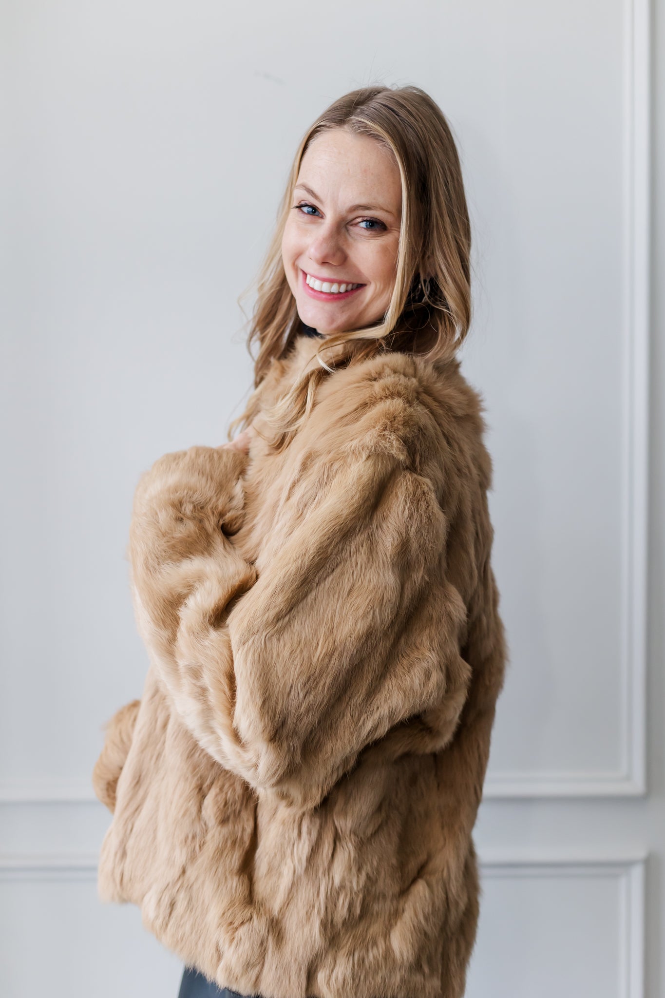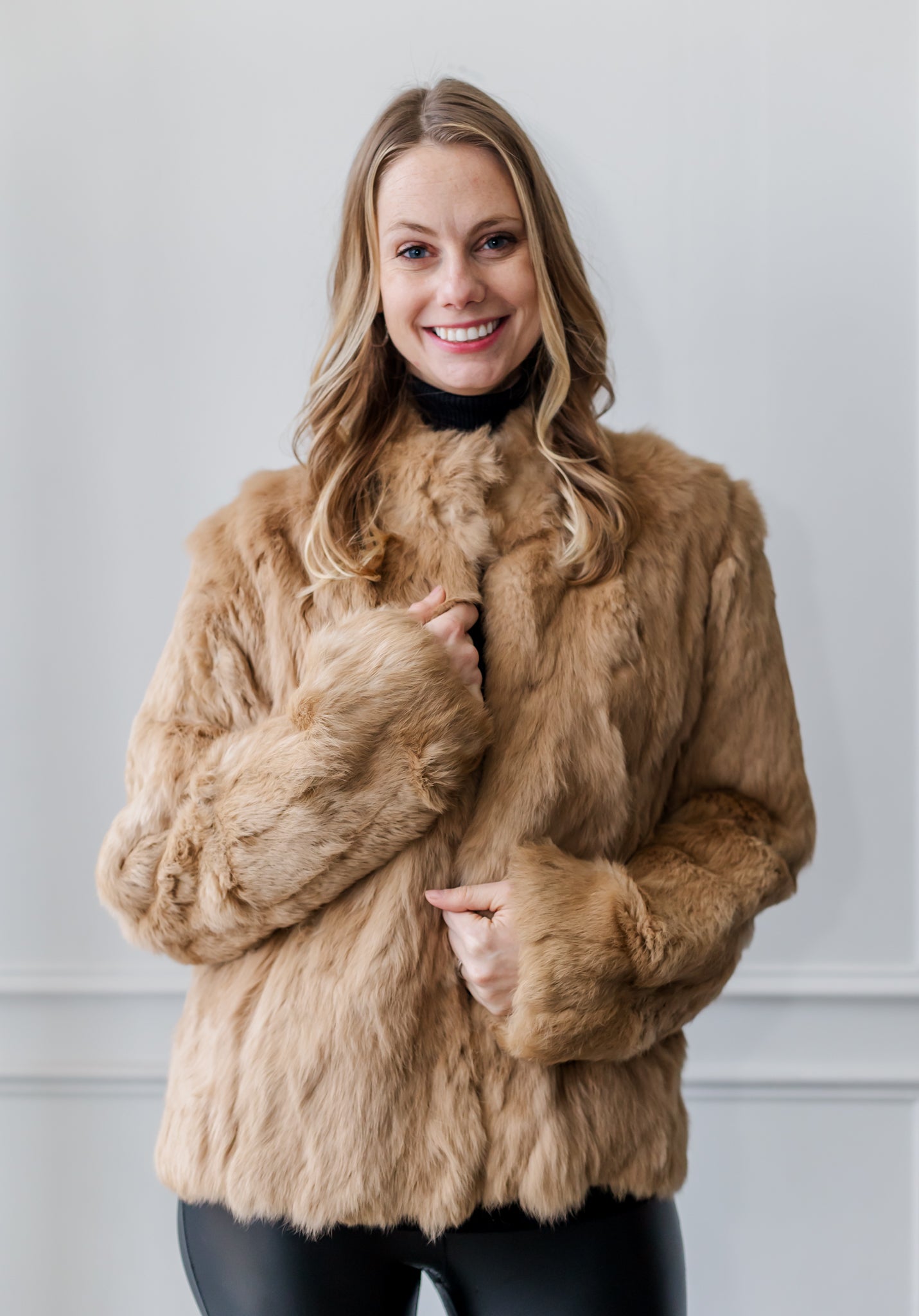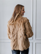 Wrap yourself in timeless elegance with this beautifully crafted tan rabbit fur jacket. Its plush, silky-soft texture offers exceptional warmth without feeling bulky, making it the perfect piece for cold winter days. The natural tan hue adds a sophisticated, versatile touch that pairs effortlessly with both casual and refined looks. Featuring a clean front, subtle structure, and cozy hand-warming pockets, this jacket blends comfort and chic design with ease. Ideal for anyone looking to elevate their winter wardrobe with a statement of understated luxury.