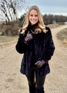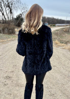 Sleek and impeccably modern, this black mink jacket stands apart with its sculpted texture. Instead of straight pelts, the mink is expertly cut and patterned to create a subtle, dimensional design that shifts with movement. The result is a rich, velvety surface that catches the light in waves—luxury you can see and feel.