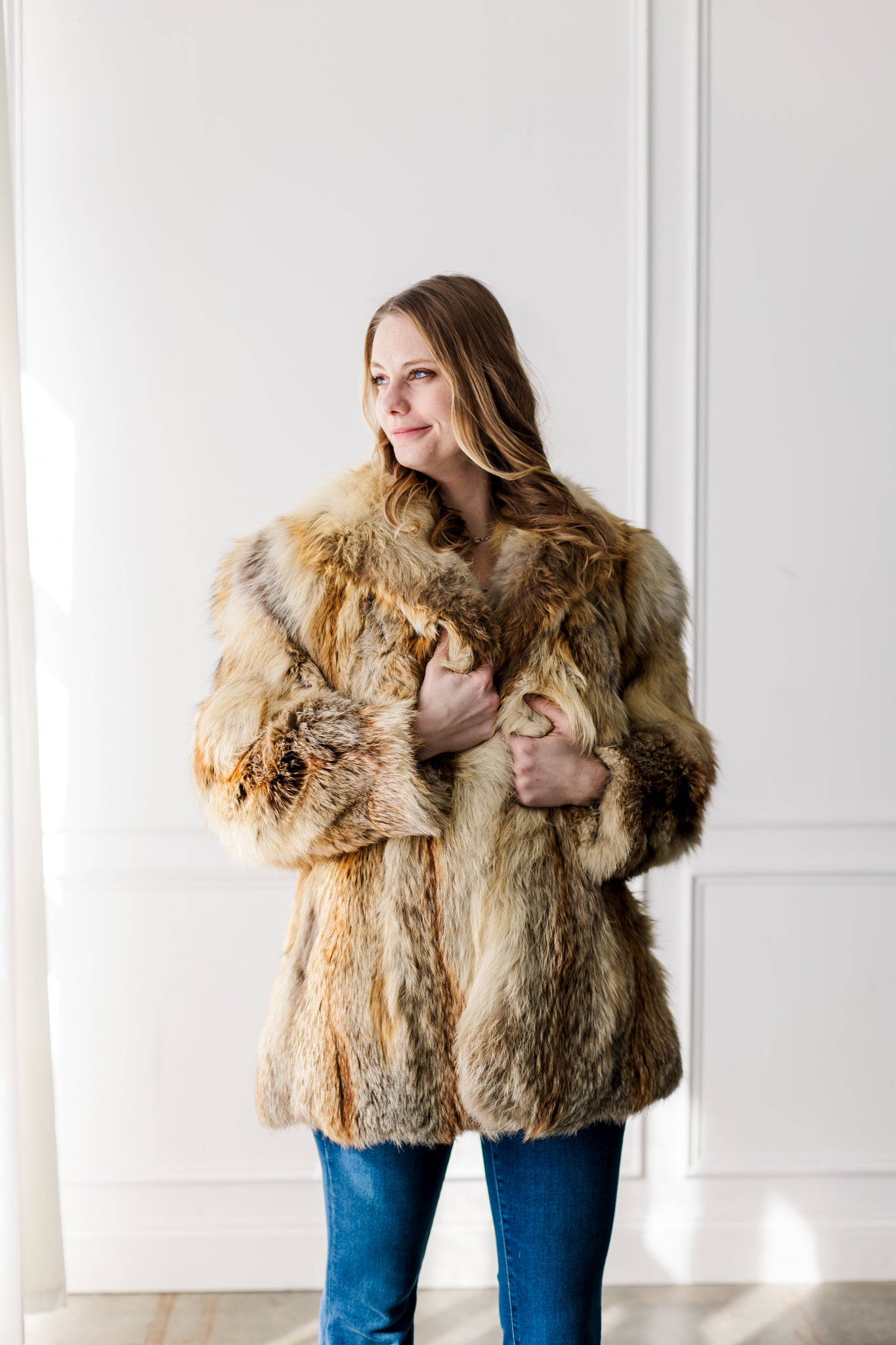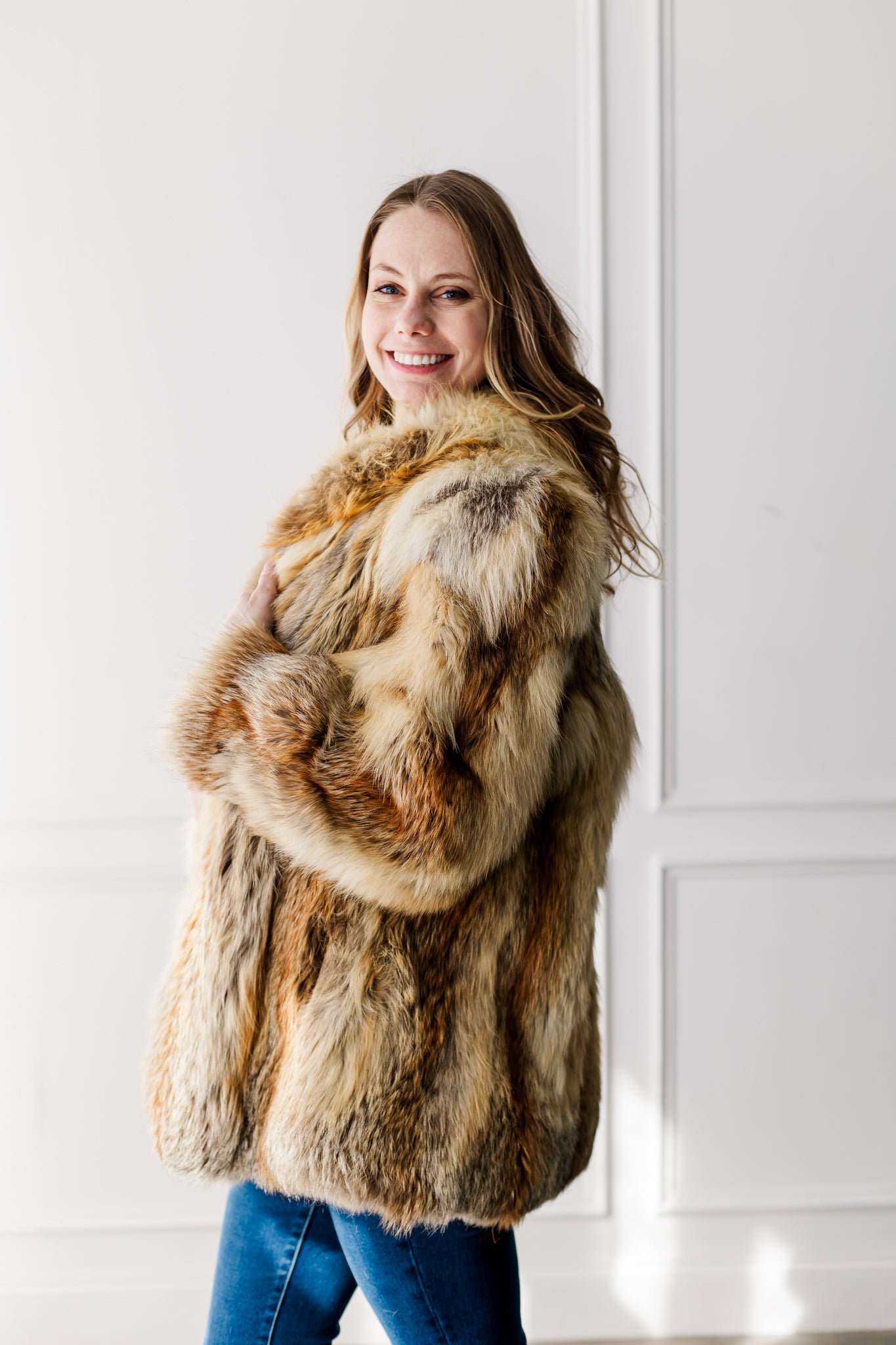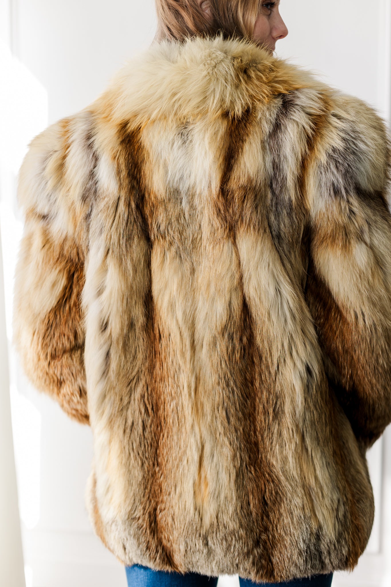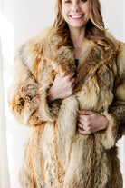 This luxurious gold fox coat showcases the stunning natural beauty of premium fox fur, with rich tones of golden honey, cream, and warm amber. The plush, full fur creates incredible volume and softness while offering exceptional warmth. Designed with a classic silhouette and a beautiful shawl collar, it drapes effortlessly for an elegant, statement look. A timeless piece that highlights the bold, natural patterning unique to gold fox.