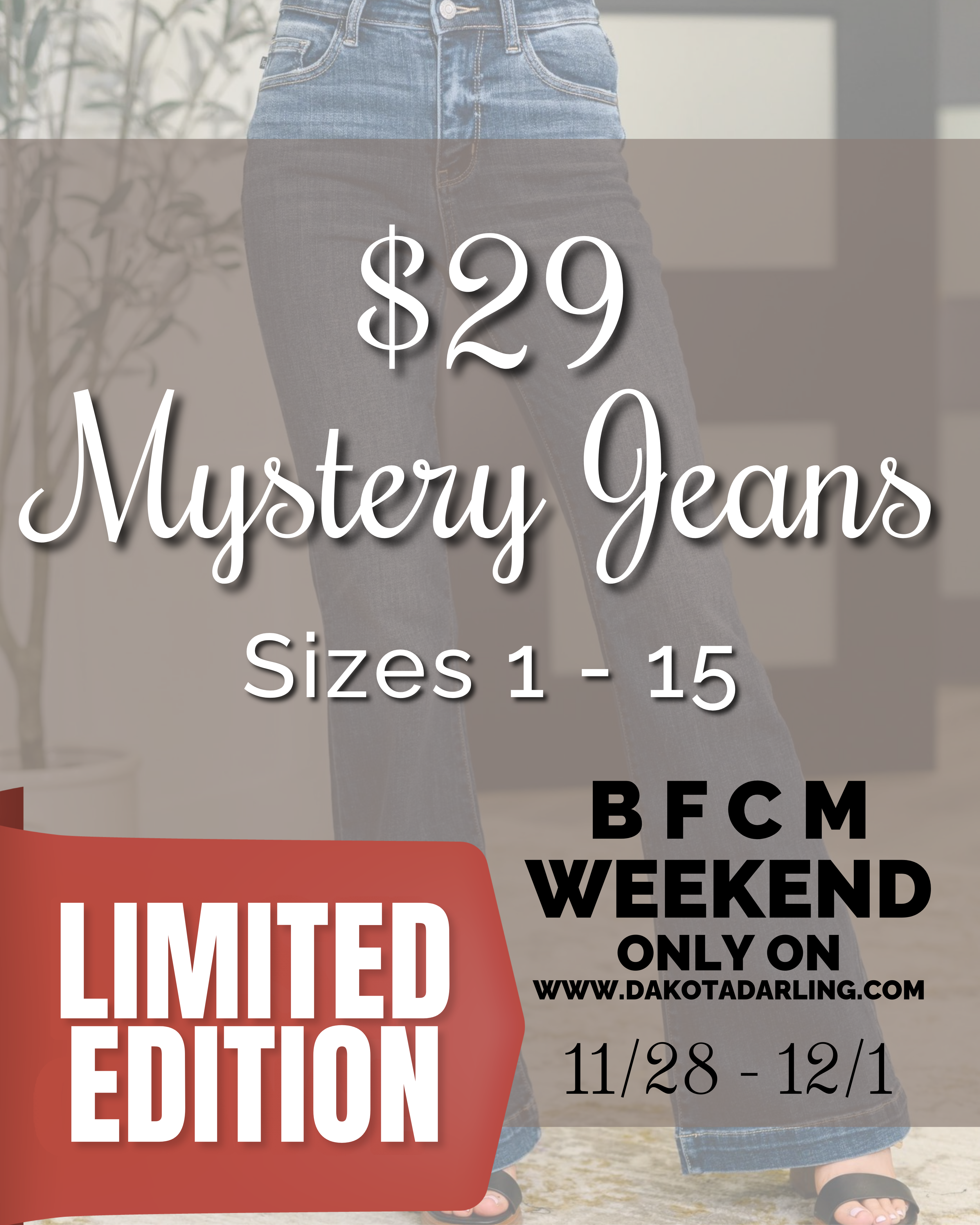 $29 Mystery Jeans - say WHAT?! Get a pair of our most popular pairs of jeans for only $29! True to size! Brands include: Judy Blue, Lovervet, Rubies + Honey PLUS MORE!
