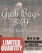 Our beloved Grab Bags are here just for Black Friday Weekend!! Your Grab Bag will stuffed with a minimum of 5 items and up to 10 items! Items will include: blouses, cardigans, blazers, graphic tees, leggings, dresses, jewelry, accessories and more! All items will be true to size.