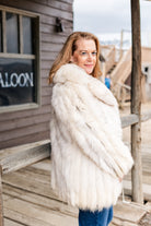 This stunning Saga fox fur coat is a showstopper, designed for those who love to make a bold statement. The coat features lush, voluminous fox fur in a pristine white hue that exudes glamour and confidence. Its dramatic silhouette and plush texture give it a big personality, effortlessly commanding attention. Ideal for making a striking impression at any occasion, this coat combines luxurious warmth with an unforgettable sense of style, embodying the ultimate in high-fashion elegance. This luxurious jacket features hook-and-eye closures and a removable waist belt.